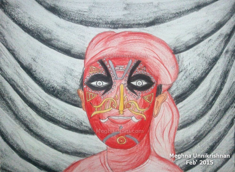 This painting was done for a competition titled ‘Face Mask’ by UNESCO France. Used Camlin Plastic crayons for this painting. This is the face make up of a Theyyam Artist, the folk art form of North Kerala.