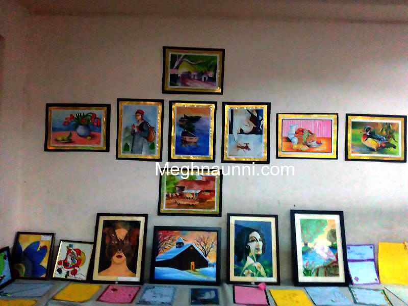 I had my paintings displayed for the art show. Took a photo of it… The middle winter snow picture is not mine. It is done by my classmate Vivek. All the pictures on the black chart and the butterfly lady face and the flower lady are my pictures.. 🙂