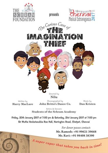 The Chennai Musical Extravaganza 2017 and The Schram Foundation Presents The Curious Case of The Imagination Thief on 20th and 21st January 2017 at Sir Mutha Venkatasubba Rao Concert Hall, Lady Andal School, Harrington Road, Chetpet, Chennai.