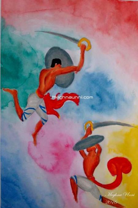 Did this painting last year. “Kalaripayattu” is an ancient martial art originated in Kerala, still popular and practiced in Northern and Central Kerala. This painting was done for an international painting competition “In My Homeland” last year.