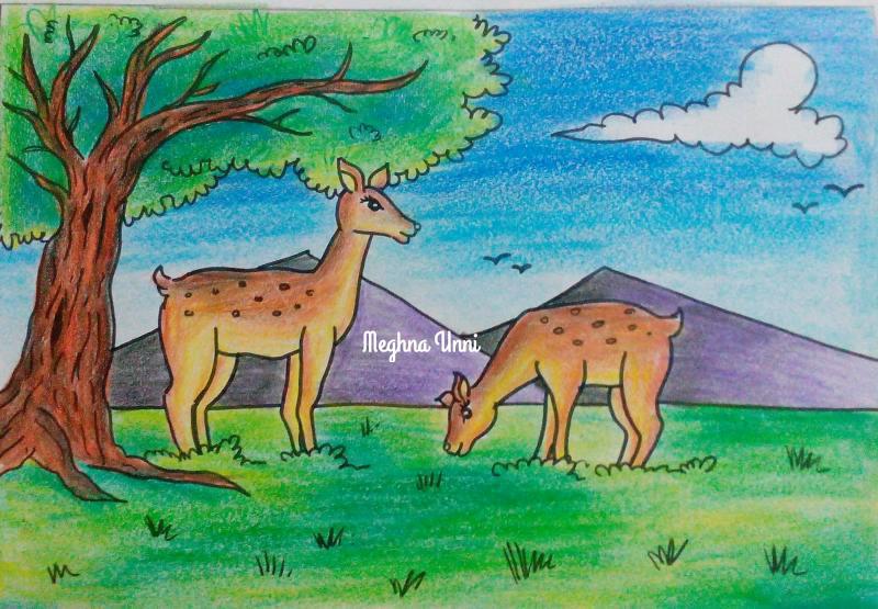 A drawing done in art class in School. Medium : Plastic Crayons. Deer Grazing Drawing. This is an Art Book Picture. Deer Grazing Drawing Using Plastic Crayons Tagged on: Animals Paintings children drawings Plastic Crayons Paintings