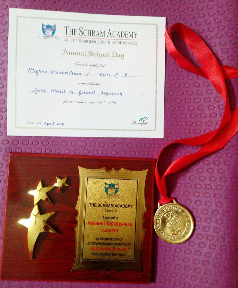 Feeling very happy that I won Gold Medal for Academic Excellence (Rank 1) and Special Achievement Award for Art for the 8th Consecutive year, at The Schram Academy Annual School Day held today (April 21, 2018) at Kamarajar Arangam. ☺☺?