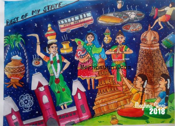 Tanjore Big Temple, Mahabalipuram Shore Temple, Bharathanatyam, Pongal, Jallikattu, Chennai Central Station, Masala Dosa, Filter Coffee, Karangattam, Poikkal Kuthirai Attam, Kanchipuram Silk Sarees, Kolam designs etc., …