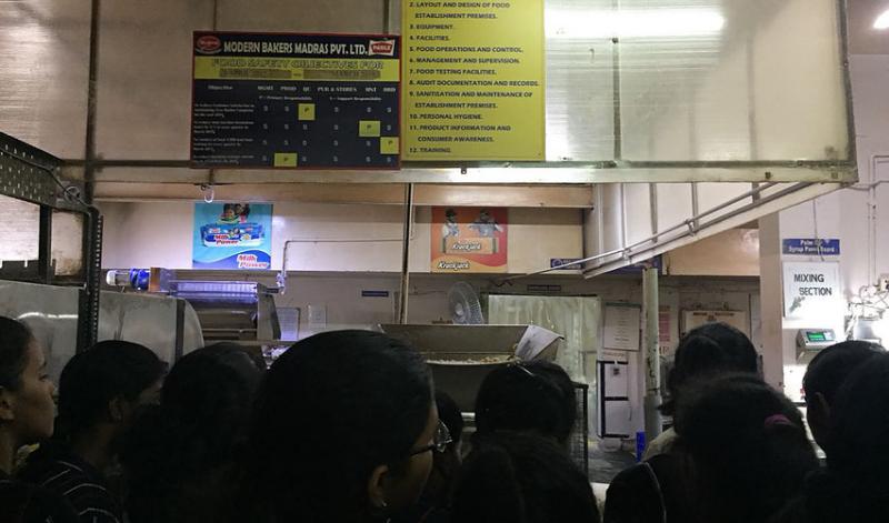 We started our journey towards the factory. Most of the travel was through the highways and toll gates. We reached the plant at 9.35 am. The sweet smell of biscuits came breezing into our nostrils, the moment we crossed the tall gates bearing the factory name “Modern Bakery”. We divided into pairs and peered about curiously at the many boards and notices, laying out rules and advertisements.