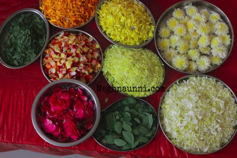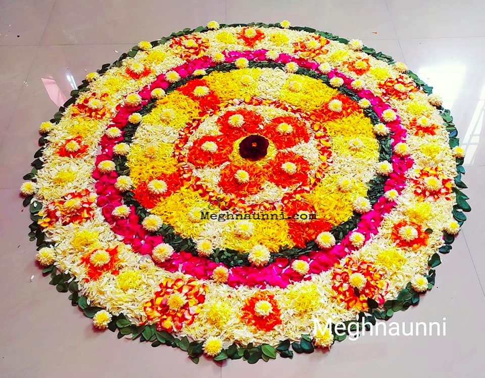 Happy Onam to everyone. Here is my Pookkalam for Onam 2019. Visited Koyambedu Wholesale Flower Market the previous day and got all the flowers I need to put this Pookkalam. Used Marigold Flowers, Pink and Red Roses, Chrysanthemum (Jamanthi Poo) Yellow and White and a single burgundy Dahlia flower for my Pookkalam, along with some green leaves I plucked from trees š