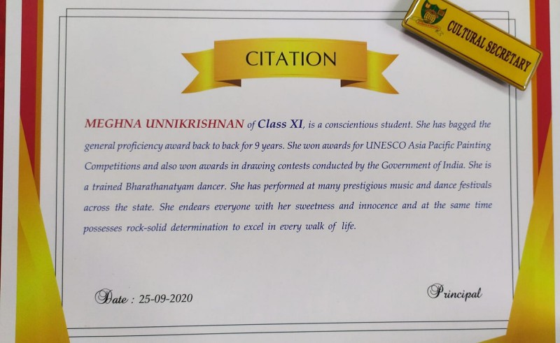Officially inducted into the School Student Council as Cultural Secretary for the year 2020-21 in a virtual ceremony today.