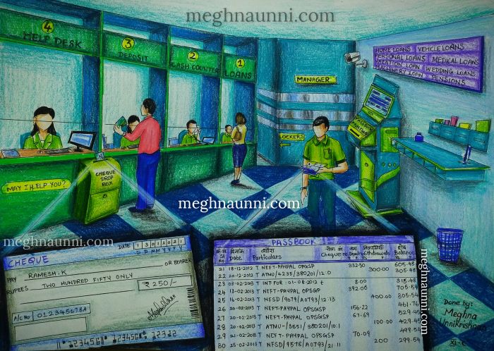 This is the project work I did for my Accountancy Art Integration Project (AIP) in Class 11. There was a choice of topic for painting or sketching the scene of a bank, so I chose that topic and drew the scene of a bank and incorporated the Accountancy topics of Passbooks and Cheques. I have drawn the inside of a bank which portrays the cash counters, loan counters, help desk, passbook printing machine, bank manager’s room etc. I have also shown a magnified part of a regular passbook and a cheque leaf.