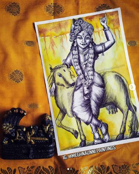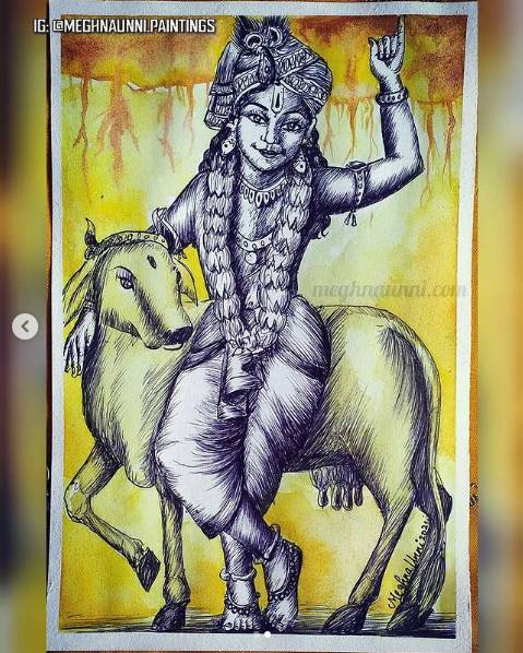 Since most of you voted for child/teen Krishna on instgram, I thought a teen Krishna lifting the Govardhana Mountain would be fine because I’ve never drawn that before😁 and after yesterday’s Kanhopatra sketch, I thought maybe ball point pen would be better rather than the usual pencil shading 🙈