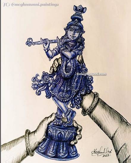 POV: The nayika as a young girl gets hold of a Krishnar bommai and it becomes her favourite thing ever. She admires the right foot crossed over the left, the graceful tilt of the hip, the lotus-like face and the manner in which He holds the flute. She grows up to fall in love with it and asks Him to come to her everyday without fail.