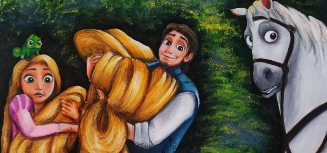 Holiday Painting – 2: A Scene from Disney’s ‘Tangled’ Movie | Rapunzel & Flynn Rider (Eugene Fitzherbert) with the horse Maximus. Dedicated to Kameshweri Akka, who gave me the idea! 😍😍 Colour Pencils with Acrylic Paint for Background Did some