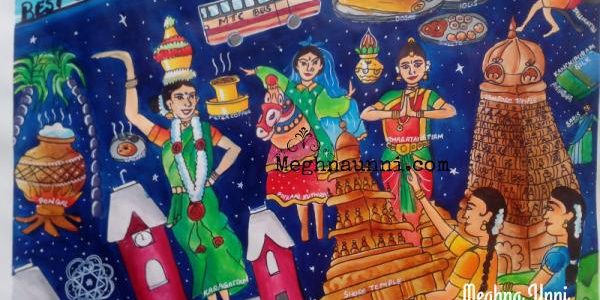 Best of My State Painting by me. Tried to depict the culture and heritage of Tamilnadu. Tanjore Big Temple, Mahabalipuram Shore Temple, Bharathanatyam, Pongal, Jallikattu, Chennai Central Station, Masala Dosa, Filter Coffee, Karangattam, Poikkal Kuthirai Attam, Kanchipuram Silk Sarees, Kolam