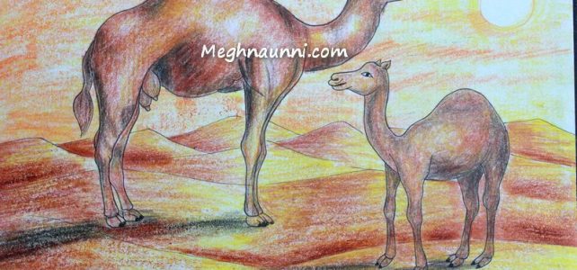 Camels Painting with Plastic Crayons. This painting is much more brighter in original, but the photo does not give its actual colour. My mother tried many times, but this is the best we could get. One of my liked paintings.