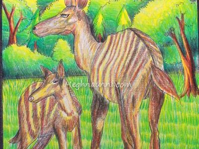 Striped Deer Painting done using Camlin Plastic Crayons. I know this painting could have been done better. 🙁 But happy that I can use plastic crayons more effectively now. Coming to Striped Deer or Bongo is a beautiful antelope