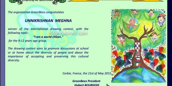 Won 8th GreenBees Drawing Contest 2015 conducted by Greenbees, Corbie, France. The Organizers received drawings from Afghanistan, Germany, Algeria, Spain, United Arabs Emirates, France, Marocco, Mexico, Peru, Philippines, India, Indonesia, Portugal, USA. The theme for this year’s contest was :