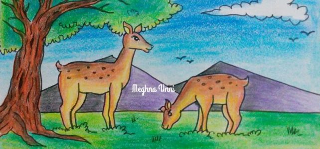 A drawing done in art class in School. Medium : Plastic Crayons. Deer Grazing Drawing. This is an Art Book Picture.