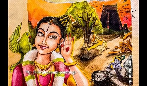 Thiruppavai 09: ✨ THOOMANI MĀDATHU ✨ 🎶தூமணி மாடத்து சுற்றும் விளக்கெரிய தூபம் கமழத் துயிலணை மேல் கண்வளரும்..🎶 Reposting my favourite pasuram’s painting I did way back in 2022!♥️ Hamir Kalyani🤌🏻 Currently halting my Thiruppavai Pasuram paintings for this year with Thoomani Madathu♥️